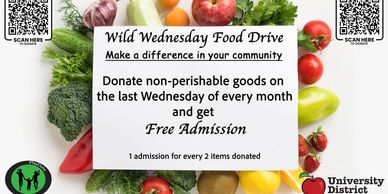 Wild Wednesday is back! Last Weds. of every month. Donate two non-perishable items or donate +$5 and earn free admission!